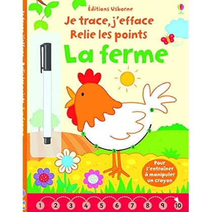 Je remercie Nathalie des éditions Usborne pour ce service presse. Le livre comprend 20 pages avec des images d'animaux de la ferme et ainsi que d'un tracteur, de la grange, le fermier et autres.L'enfant doit relié les chiffres pour affiché le dessin et au dessous le nom du dessin est écrit en pointillé pour que l'enfant puisse facilement le repasser et s'entraîner à l'écriture.Ma fille adore le concept de ce livre elle gribouille (oui elle n’a que 2 ans et demi) et efface pour mieux recommencer. Elle n'aime pas que je l'aide à écrire, elle préfère faire seule.Le livre est fourni avec un stylo effaçable très bien car c'est un stylo gros pour une bonne prise en main avec une grosse pointe très pratique pour nos enfants. (lors d'un précédents achat j'ai eu un tout petit feutre à pointe fine que m'a fille à écrasé en 2 min) du coup là je suis ravie de celui-ci et m'en sert pour tous les livres effaçable de ma fille.Je recommande vivement ce livre qui permet aux enfants suivant l'âge, du gribouillage, de commencer à relier les points et de former les lettres.Un très bon achat pour les fêtes de noël!